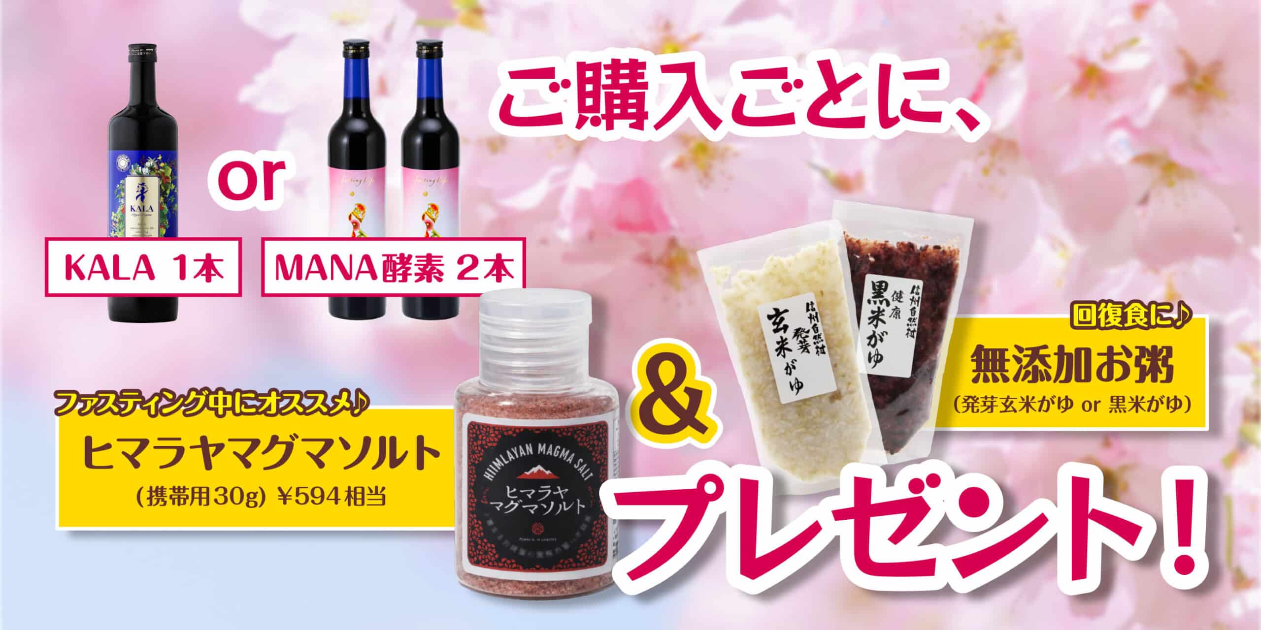 キャンペーン期間中に、マナ酵素を2本、または、KALAを1本ご購入いただくごとに、《ヒマラヤマグマソルト(携帯用30g)と無添加お粥》をプレゼントします!